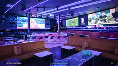 Victory Sports Bar features immersive wrap-around media walls that transform the entire space into a high-energy viewing arena. The design balances sports-bar excitement with lounge-level sophistication, offering a visually striking environment perfect for film and high-end event scenes.